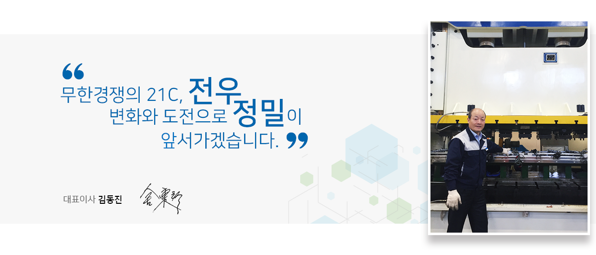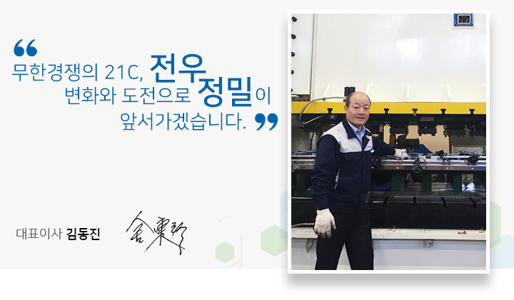 창업이래 프레스 금형 및 가공분야에 주력하여 국내 최고의 기술력과 세계적인 경쟁력을 갖춘 기업으로 발돋음하였고, 2006년도에 TS 16949 및 SQ-MARK를 인증받아 프레스 가공부문의 전문업체로 성장하고 있습니다.